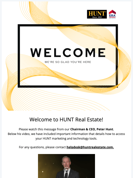 This email was designed to welcome new Sales Professionals to HUNT, providing them with the pertinent information– a generic social post, their personalized email signature and their designated business contacts within the HUNT family of companies.