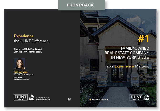 To create a portfolio that showcases the marketing collateral HUNT offers transitioned real estate agents. The design needed to appeal to their experience and showcase the various pieces such as web, print, signage, etc.